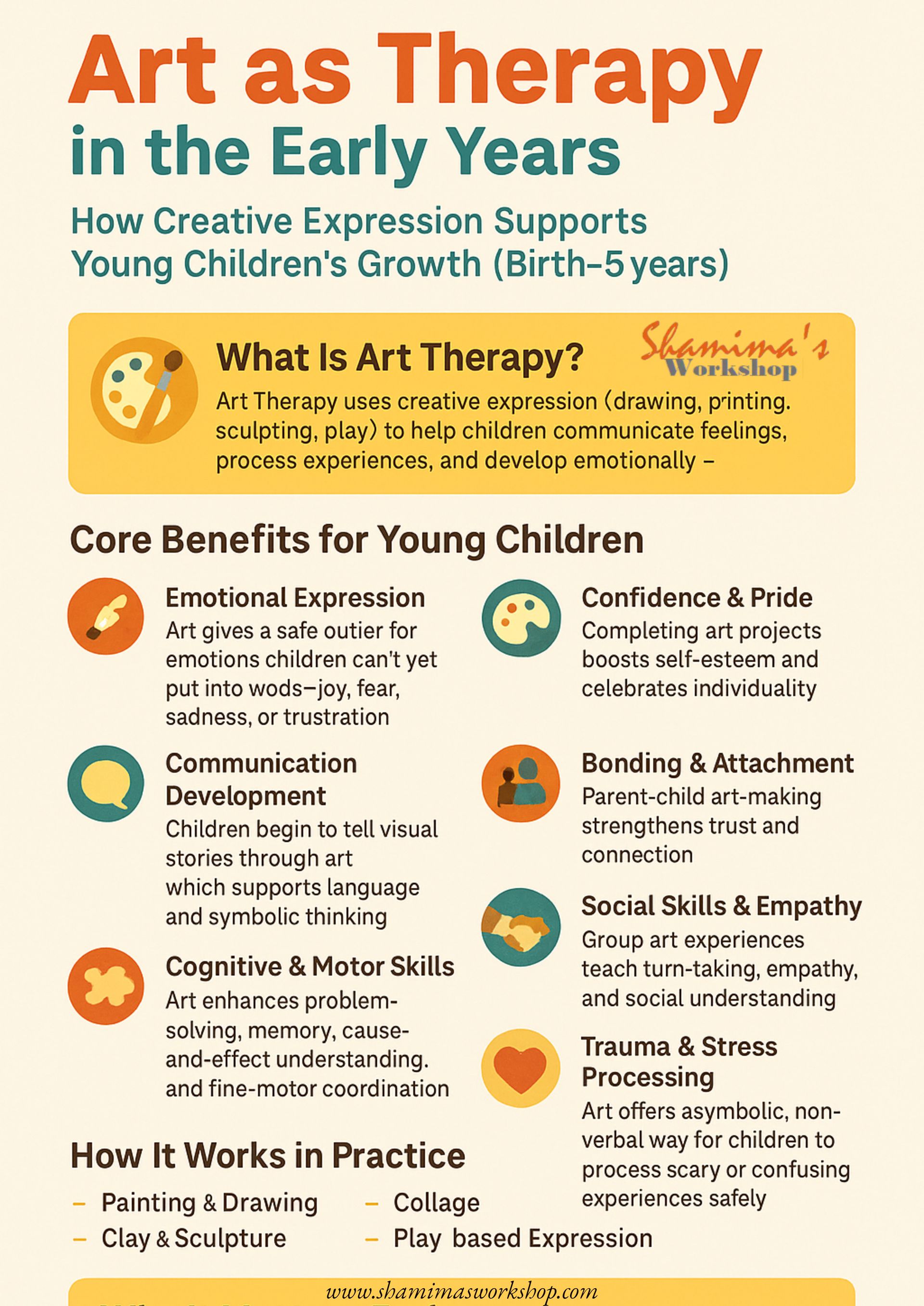Art Therapy in the early years is a gentle, creative approach that helps young children express emotions, explore their inner world, and make sense of their experiences through play and imagination. Long before children have the words to describe how they feel, art becomes their natural language — a bridge between feelings and understanding. Through drawing, painting, movement, and sensory exploration, children aged birth to five can safely communicate joy, fear, curiosity, or sadness. In early childhood settings, Art Therapy not only nurtures emotional wellbeing but also enhances social, cognitive, and physical development, supporting the whole child in a holistic, compassionate way.